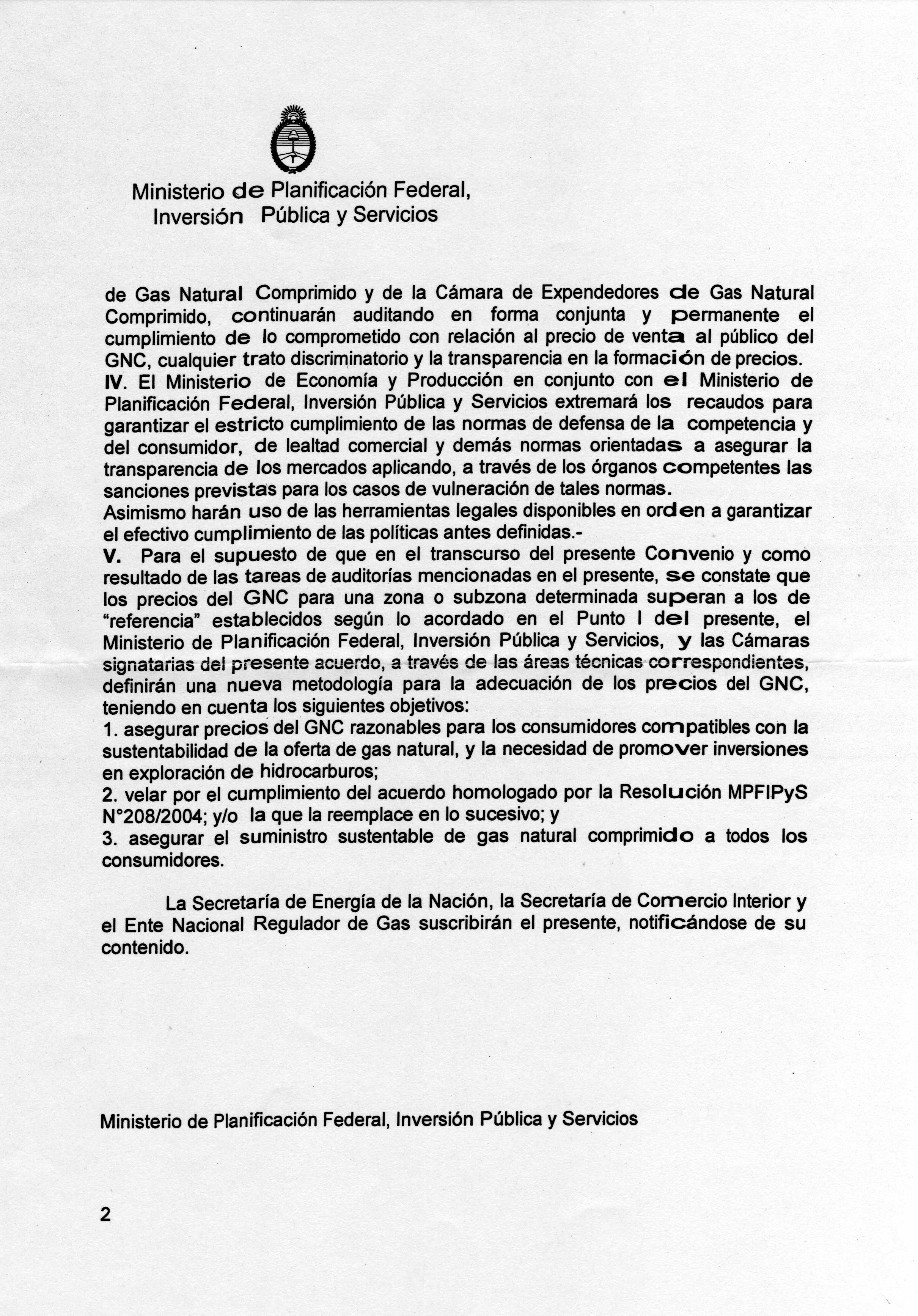 Al cabo de algunas charlas sobre el texto y los alcances del nuevo acuerdo, las partes convinieron reunirse el 27/12/06. Como su antecesor, el nuevo acuerdo contempla que el sector mantiene los precios actuales de venta del GNC durante el año 2007, sujeto y condicionado a que no se produzcan incrementos en los precios de compra del gas en el punto de ingreso al sistema de transporte o incrementos en los costos y tarifas de transporte y distribución. En caso contrario cae automáticamente el acuerdo y queda sin efecto. Además si se producen situaciones extraordinarias o incrementos de otros costos (energía eléctrica, impuestos, tasas, etc.) intervendrá una comisión (Enargas/Secretaría de Comercio/Cámaras Representativas) que analizará y evaluará en cada caso el impacto sobro el costo del GNC.